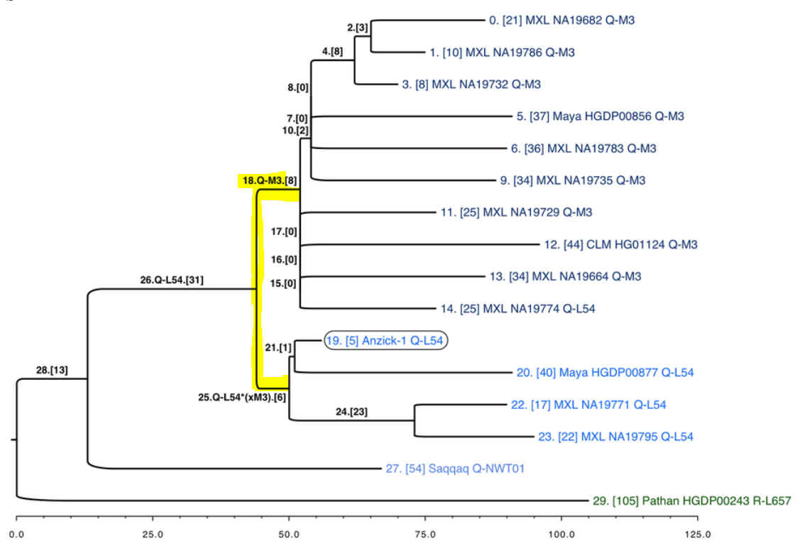 Die Subglade Q1a3a - L54 ist endgültig amerikanischen Ursprunges (mit einer höheren Frequenz in Mexiko und Mittelamerika), auch wenn gelegentlich einige Ostsibirier auch diese Haplogruppe