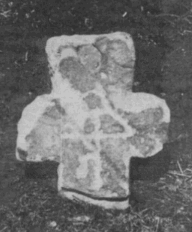 einer ehemaligen Neubauernwirtschaft den Oberteil eines parallelkantigen lateinischen Kreuzes. Der Fuß ist schräg abgebrochen, der linke Arm ist oberhalb abgeschlagen, der Kopf zum Teil verwittert, in ihm befindet sich eine kreisförmige Aussparung. Auf dem Kreuz ist eine 32cm hohe Armbrust mit 23cm Sehnlänge schwach eingeritzt. Von der Armbrusthöhe entfällt die Hälfte auf den Schaft, an dem sich links die Spannwinde befindet, ein Viertel auf die Bogenhöhe und das restliche Viertel auf den Bügel, in den der Schütze beim Spannen trat. Sandstein. 59cm (ganze Höhe): 47cm:13cm. Spätes 15. Jahrhundert.